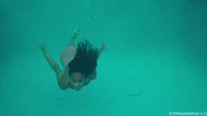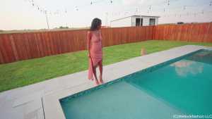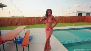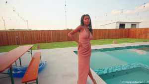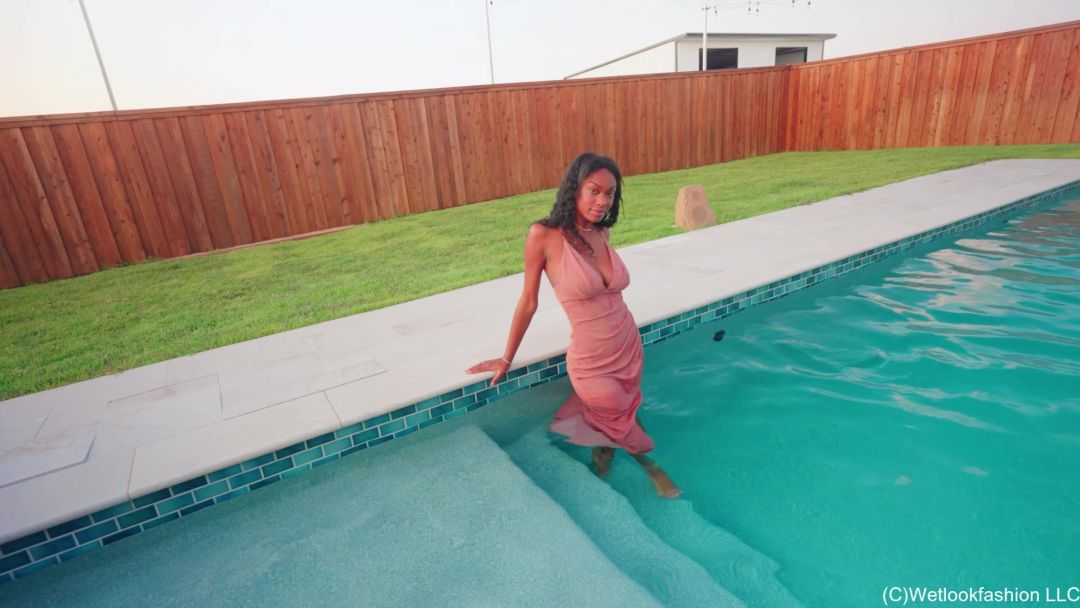 Amy hangs out at the pool on a beautiful summer evening ready for a night out. She is wearing a sexy sparkly evening gown and heels. The water is just looking so nice, so she decides to take a swim in the dress instead of going out. She first shows off her outfit dry and then she goes in the pool and slowly soaks her outfit until it is completely soaked and then she dunks under to also get her hair wet. Whenever she comes out of the water, her dress is very clingy and also you can see it sparkle from the evening sun. She swims underwater plenty of times and she also dives in the pool wearing her dress and heels. Scene contains underwater footage.