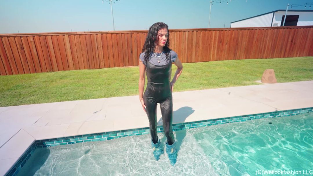 Carla is enjoying the sun outside, wearing a sexy black jumpsuit, a shirt and boots. She first walks around a little bit, showing off her outfit while dry. Then she steps in the pool, first soaking her denim boots and her jumpsuit after when she sits down on the stairs. A few moments later she steps in the pool completely, having her complete outfit soaked and her hair mostly. She floats on her back for a little bit and then she dunks under getting her hair completely wet. She continues to swim for a while, going underwater plenty of times and also diving in a few times. She also shows off her wet outfit plenty of times. At the end of the clip she does a few handstands underwater and when she emerges she lets her hair in the face. Scene contains underwater footage.